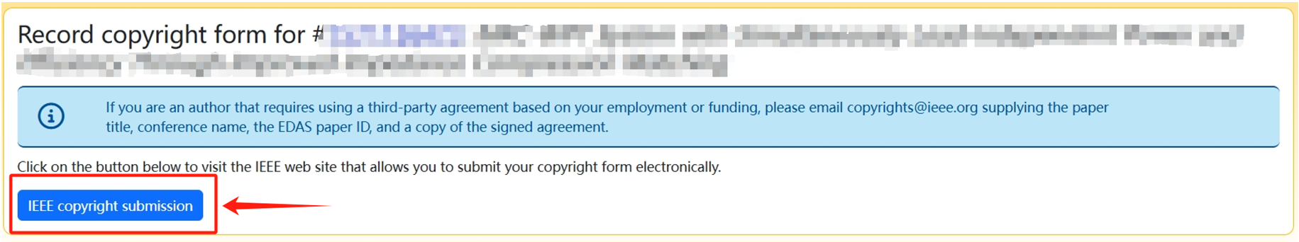 Step 3: Click " IEEE copyright submission " button to access the IEEE website, and follow the instructions to submit the publication agreement.
